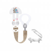 Permite sujetar el chupete a la ropita, evitando que caiga al suelo y se ensucie o se pierda. La pinza, que se sujeta a la ropa, lleva unida una argolla en la que introducir el chupete. El complemento más cómodo y práctico, a la vez que exclusivo de tu bebé. A partir de 0 meses. Materiales: 0% Bisphenol.