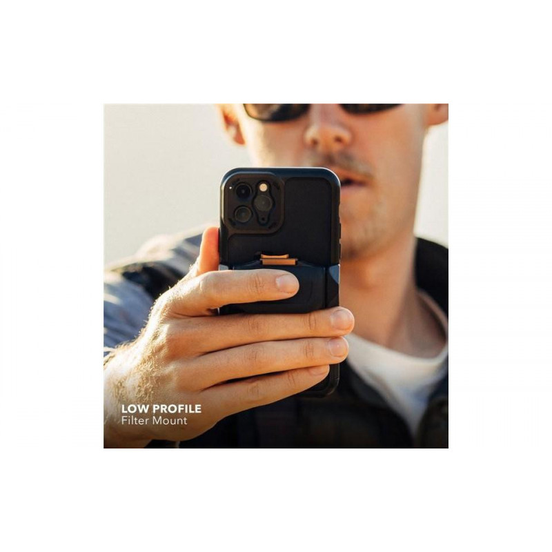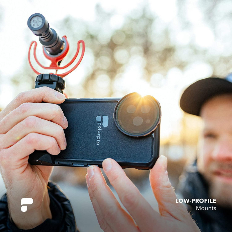 El estuche negro es flexible y tiene un contorno protector duro. El asa y la cubierta son los dos accesorios más esenciales de la serie PolarPro LiteChaser Pro. El asa está especialmente diseñada para colocarse sobre la caja. Le permite tener un mejor agarre del teléfono mientras graba el contenido horizontalmente y en modo vertical. Además, el mango tiene un orificio para tornillo de 1/4 de pulgada en ambos extremos, lo que permite colocarlo en un trípode. El asa se puede unir a la caja en cuatro posiciones. La funda también hace que su iPhone 11 esté listo para usar, por lo que puede colocar filtros de alta calidad de la serie LiteChaser Pro de PolarPro en su teléfono.