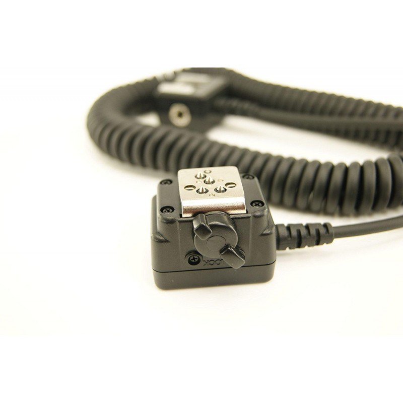 Este cable de extensión remoto en espiral está diseñado para conectar una cámara con un flash externo. Su longitud es de 1.5 m y está enrollado para permitir que se maneje más fácilmente.