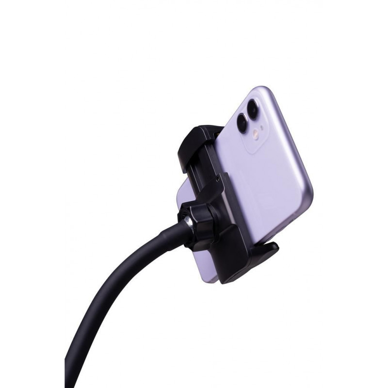 El robusto soporte para teléfono inteligente se adapta a teléfonos inteligentes con un ancho de 60 a 90 mm . El teléfono inteligente simplemente se sujeta entre las dos abrazaderas de goma . Para alinear el teléfono inteligente y las luces anulares, simplemente doble el cuello de cisne flexible correspondiente en la posición deseada.