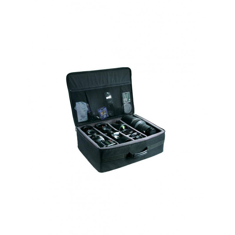 Es un organizador simple, ligero y que ocupa poco espacio para tener el equipo de foto y vídeo protegido. Para moverlo tiene un asa lateral.