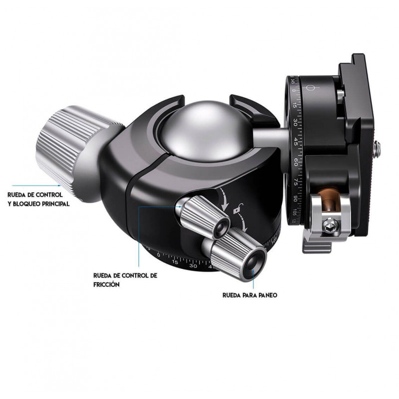 Rótula Leofoto LH-36PCL. Con una bola de precisión de 36mm de diámetro. Doble rotador panorámico y bloqueo de palanca reforzado. Movimiento muy suave. Incluye zapata extraíble tipo Arca Swiss. Base de 52 mm. Soporta hasta 18 Kg. Peso de 430 gramos