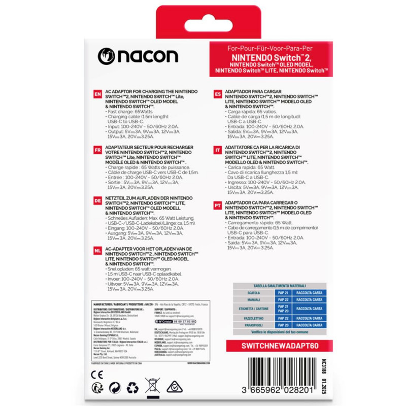 ¡Potencia tu juego al máximo con el Nacon Cargador Nintendo Switch 2! Con carga rápida y 65W de potencia, disfrutarás de cada aventura sin interrupciones. ¡Stock disponible localmente en Canarias para que no esperes más!