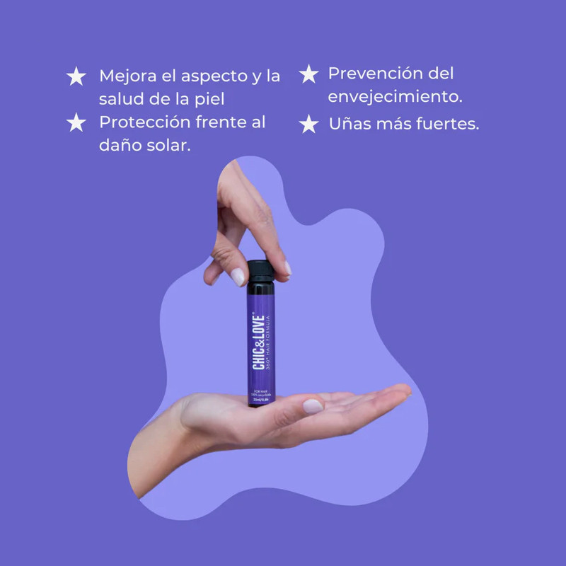 Presentamos 360º Hair Formula, un complemento nutricional bebible especialmente diseñado para combatir eficazmente la caída del cabello. Nuestra fórmula única contiene más de 12 principios activos naturales y veganos, respaldados por dermatólogos y farmacéuticos, para brindarte resultados excepcionales.