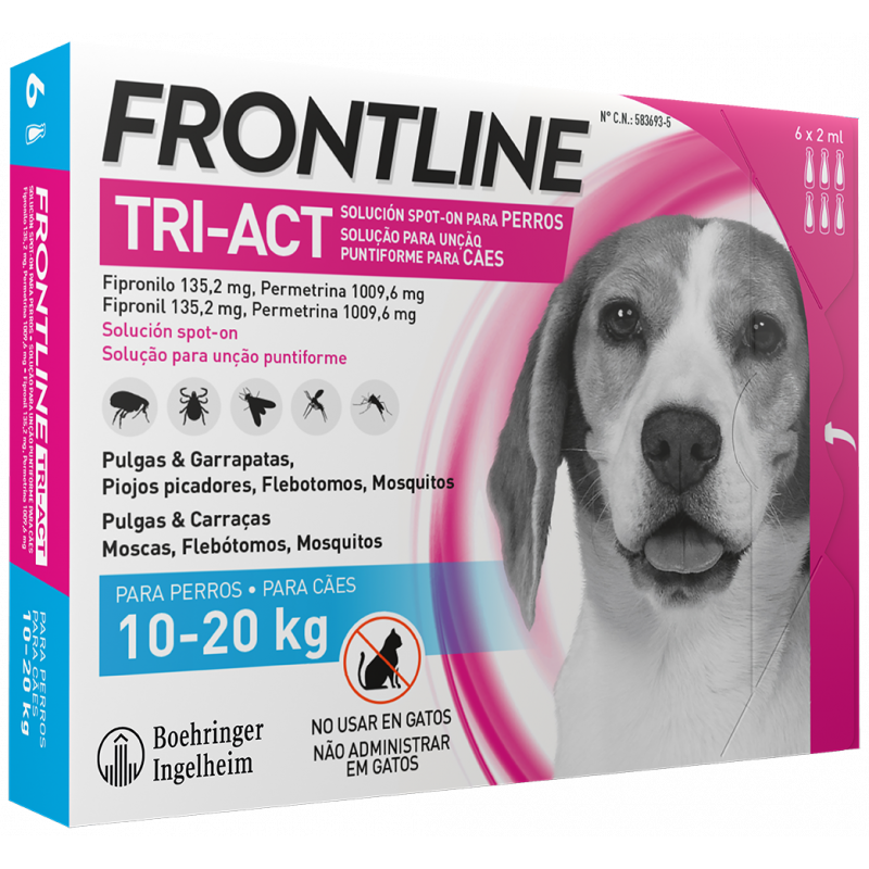 Frontline tri-Act es efectivo para el tratamiento y prevención de infestaciones por pulgas y/o garrapatas así como para proporcionar un efecto repelente frente a insectos voladores (mosquitos, flebotomo y moscas picadoras).