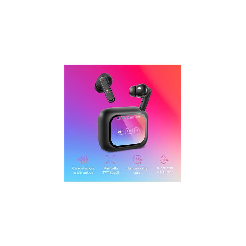 KSIX Vision Auriculares Inalámbricos con Cancelación de Ruido ANC y ENC - Auriculares Deportivos con Control Táctil y Pantalla TFT Táctil - Earphones Negros con Asistente de Voz 20h