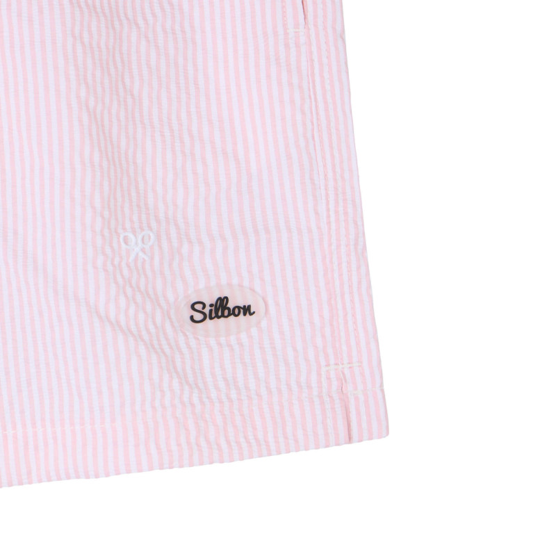 Bañador de rayas confeccionado en poliéster. Presenta cintura elástica con ajustable personalizado, red interior y bolsillo parche trasero.