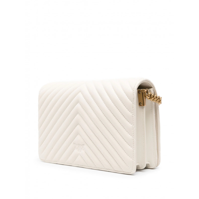 Blanco crema, piel de becerro, acolchado estilo chevron, logo grabado en la parte posterior, hebilla Love Birds característica, parte superior plegable con cierre magnético, correa de cadena y cuero removible para el hombro, bolsillo interno con cremallera y compartimento dividido. Exterior: Piel De Becerro 100% Profundidad 7 cm Altura 15 cm Correa 57 cm Ancho 25 cm