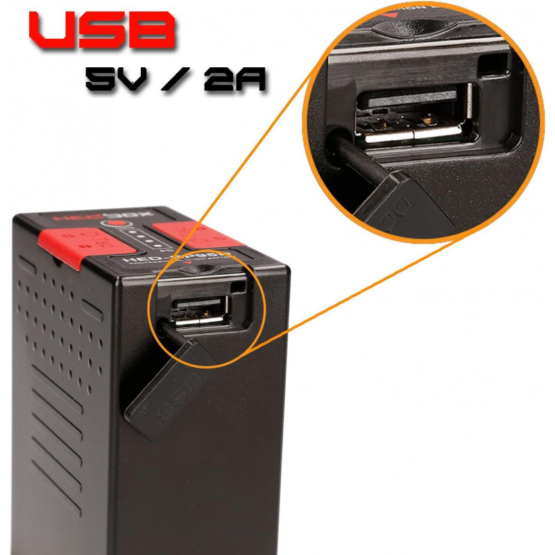 - CARACTERÍSTICAS: Salida doble 2x D-Tap 14.4V / 8A / 95W incorporada y toma de salida USB 5V / 1A