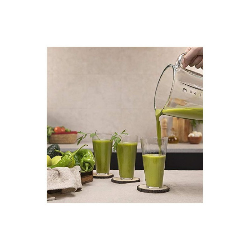 Batidora de vaso con acacados en acero inoxidable de 1300 W, con cuchilla con recubrimiento de titanio negro y 1,8 L de capacidad. Incluye filtro para licuados sin pulpa.