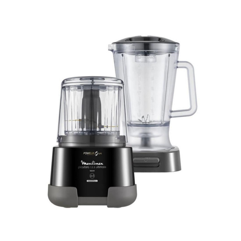 La Moulinex DP815855 es una picadora 1,2,3 Ultimate Blender diseñada para ofrecer versatilidad en seis funciones en un solo producto: corte, picado, rallado y mezcla en el tazón de corte y batido con el batidor.