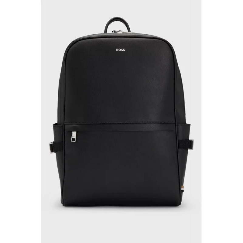Una mochila BOSS moderna confeccionada en material con estructura. Este accesorio con cincha a rayas de la marca cuenta con el detalle del logotipo en el ribete. Medidas: 41 × 28 × 12 cm Largo: 28,0 cm Ancho: 12,0 cm Alto: 41,0 cm Parte superior con cierre: Cierre con cremallera doble 1 bolsillo interior con cremallera Acabados metálicos: Detalles metálicos de color plateado brillante Logotipo exterior grabado Asa superior Composición: 100% Cuero regenerado, Forro: 100% poliester (reciclado), Adorno: 100% poliester (reciclado), 100% Poliamida (reciclada)