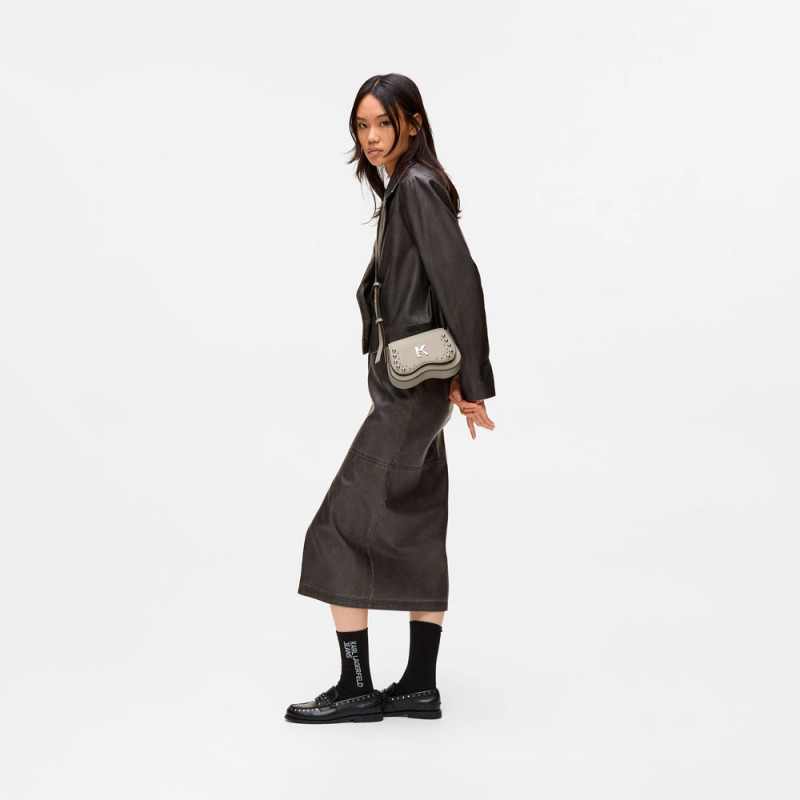 Un bolso bandolera pequeño pero práctico con un diseño único inspirado en unas gafas de sol en homenaje a las lentes oscuras predilectas de Karl Lagerfeld. Cuenta con una correa ajustable para poder llevarlo de distintas maneras y presenta tachuelas atrevidas y un llamativo aplique con el logotipo K.