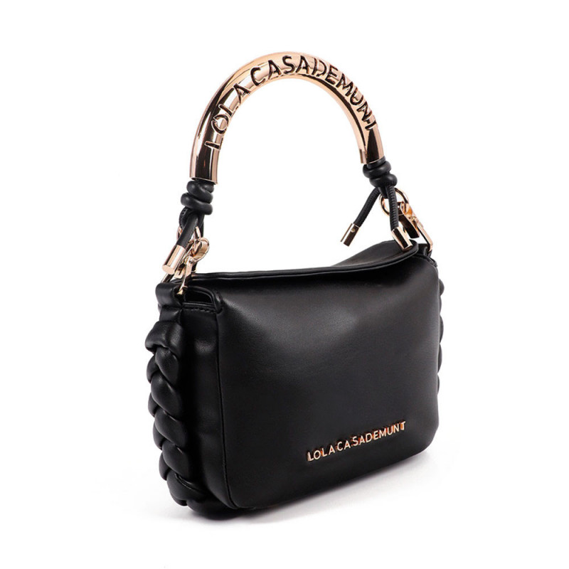 Mini bandolera de diseño elegante con asa metalizada personalizada. Fabricada en material de alta calidad que asegura durabilidad. Interior espacioso con cierre magnético seguro. Diseño versátil con detalles trenzados a los lados y logotipo grabado. Ideal para complementar tus looks diarios con estilo sofisticado.