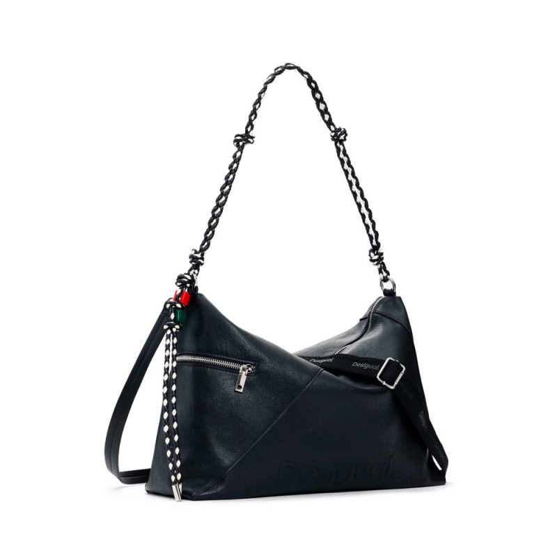 Este bolso grande destaca por su diseño elegante en color liso y su acabado efecto piel, realzado por el logo Desigual grabado en relieve en el mismo tono para un acabado sofisticado y discreto. Un accesorio amplio y versátil, pensado para acompañarte en tu día a día con estilo y funcionalidad.