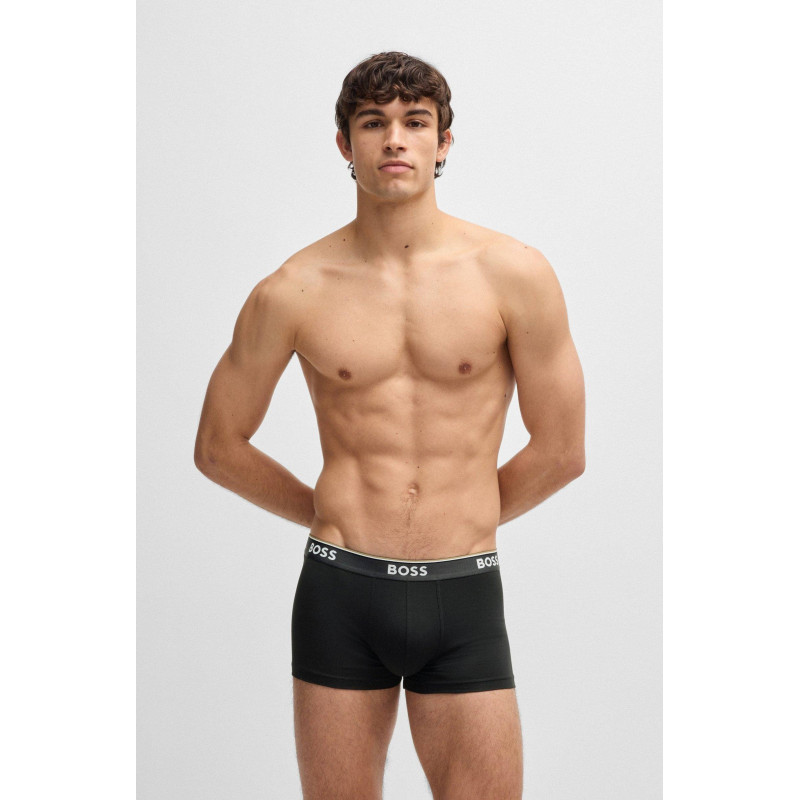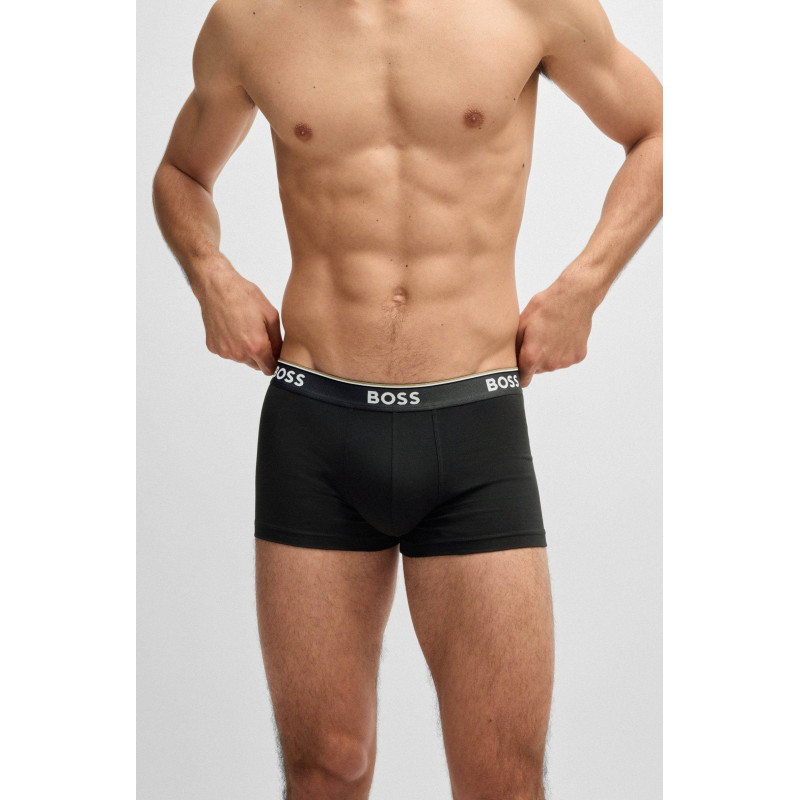 Tres boxers BOSS Hombre muy cómodos en punto de algodón elástico. Cada pieza presenta una raya de la marca y logos repetidos en la cintura de tiro medio.