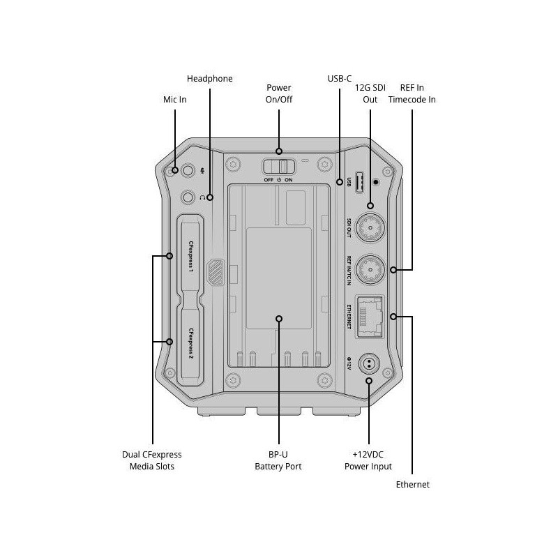 Blackmagic PYXIS tiene una amplia gama de conexiones de audio, monitoreo, alimentación y otras. La cámara incluye una salida 12G-SDI para monitoreo con soporte para salida HDR y Ultra HD. Esto significa que puede conectar una pantalla SDI para monitorear el video en el set, con o sin superposiciones que muestren información crítica y el estado de la cámara. SDI permite recorridos de cable mucho más largos que HDMI, lo que facilita llegar a monitores más alejados en el set. También hay un conector mini XLR con alimentación fantasma de 48 voltios para micrófonos, una entrada de micrófono de 3,5 mm estilo cámara de vídeo, una entrada de código de tiempo, una entrada de referencia, un conector de auriculares y un conector de alimentación CC con bloqueo.