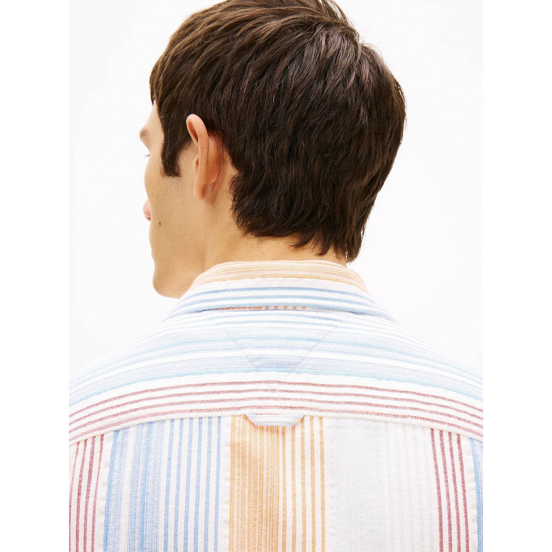 Esta camisa de corte amplio está confeccionada en tejido dobby de puro algodón, que aporta un toque de textura, y se distingue por el diseño integral de rayas verticales mixtas.
