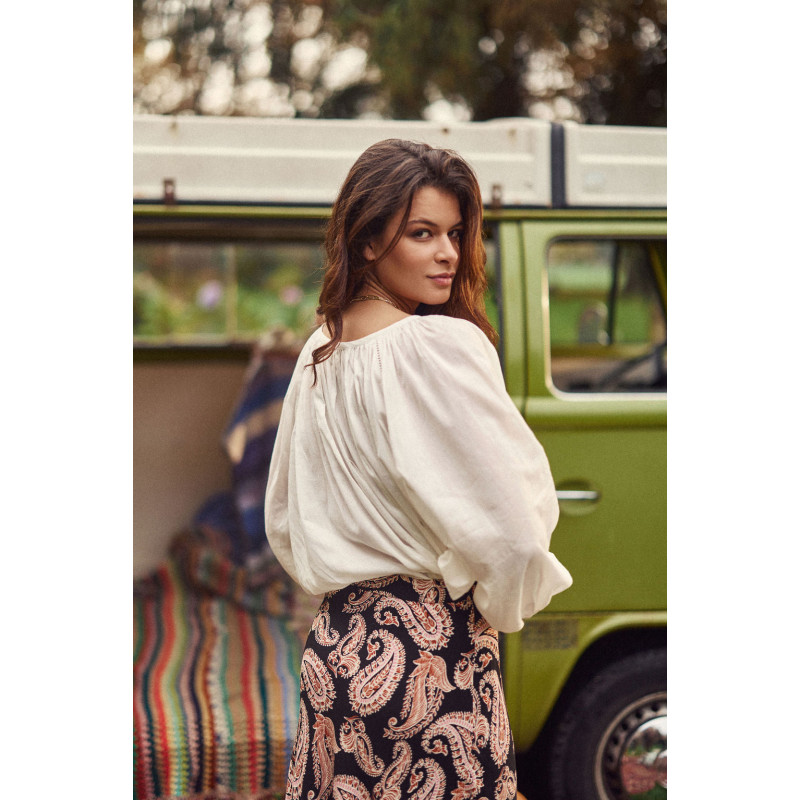 La blusa Blazie de algodón 100% combina ligereza y comodidad con su corte holgado y sus mangas globo. Su escote redondo fruncido, realzado por una elegante caída en la parte delantera, aporta un toque de delicadeza a este diseño fluido y vaporoso.  Composición: 100% algodón - Blusa holgada - Escote redondo con fruncidos - Gotas en el centro del escote delantero - Sisas raglán y mangas globo La modelo mide 1,73 m y lleva la talla 36 País de fabricación: India