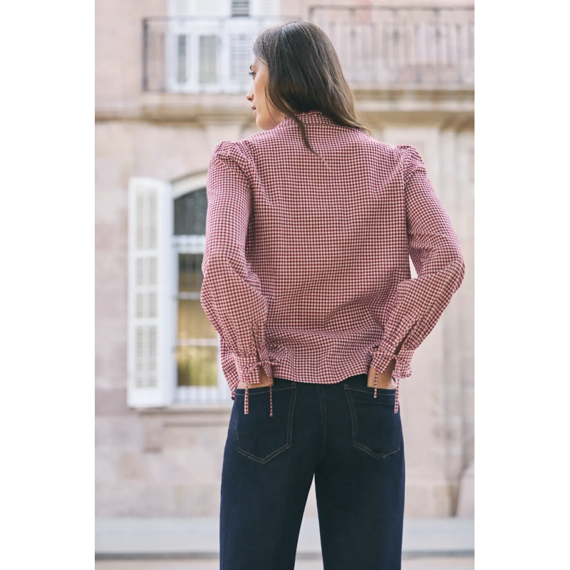 La Camisa Medine Vichy Rojo de eseOese es una blusa femenina confeccionada en 100 % algodón BCI, con estampado de cuadros vichy en rojo que aporta personalidad sin perder sofisticación. Presenta cuello con detalle de volante, mangas abullonadas con lazo en el puño y cierre frontal con botones. Su corte recto permite un ajuste cómodo y fluido, ideal para combinaciones que van del look casual-chic al más arreglado. El largo de la prenda para la talla S es aproximadamente 61 cm.  Detalles del producto: * Material: 100 % algodón BCI * Estampado: cuadros vichy rojos * Cuello: volante * Manga: larga con efecto abullonado y lazo en el puño * Cierre: botones frontales * Corte: recto * Largo aproximado para talla S: 61 cm  * Color: rojo vichy * Marca: eseOese