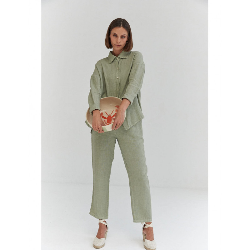 Camisa oversize de lino con cuello camisero y botonadura frontal Canesú en espalda con fruncido Manga larga acabada con botón en trabilla y puño con abertura Bajos redondeados Diseñado y fabricado en España 100% lino La modelo lleva una talla S