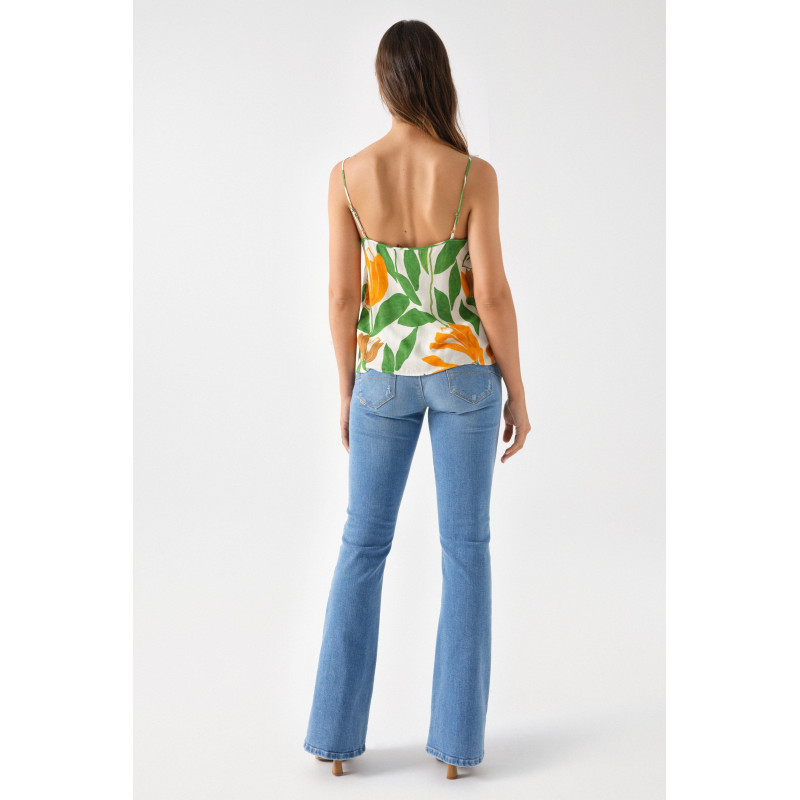 Llévate un jardín contigo allá donde vayas. Este top de estampado floral es fluido, ligero y delicado, perfecto para llevarlo del amanecer al atardecer. El cuello redondo con pliegues añade un toque de elegancia, mientras que los tirantes ajustables garantizan el ajuste ideal para cualquier ocasión. Nos encanta su combinación de colores vivos para completar el vestuario de la temporada. - Top estampado floral - Tricolor - Corte recto - Cuello redondo con pliegues - Tirantes ajustables