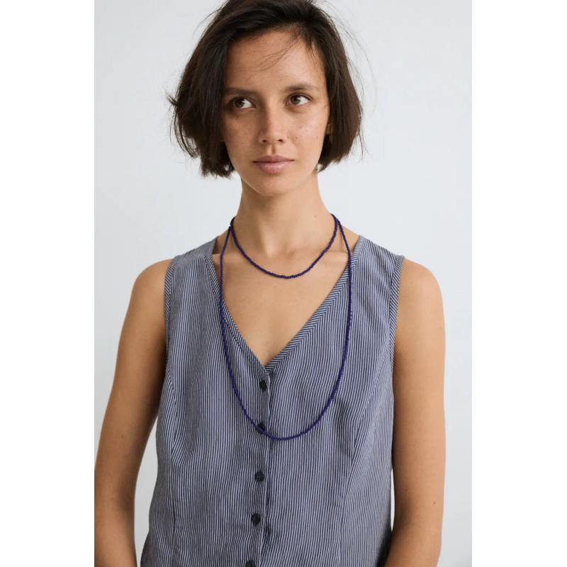 Ref.: 303721-1170 // TOP.BRETAGNE Top fluido. Tejido mezcla viscosa. Diseño de rayas. Escote pico. Sin mangas. Detalle de pinzas en la parte delantera. Cierre de botones. Fitting recto. Dispone de una falda a conjunto, se vende por separado. Esta prenda se ha confeccionado con materias y procesos sostenibles que reducen el impacto medioambiental Made in Morocco 85% Viscosa - 15% Poliamida