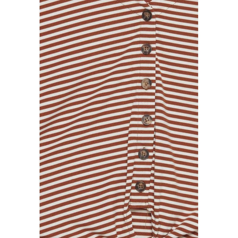 Camiseta manga larga a rayas de cuello pico, abotonado central y lazo en el abdomen.   Composición: 65% Poliéster,30% Viscosa,5% Elastano