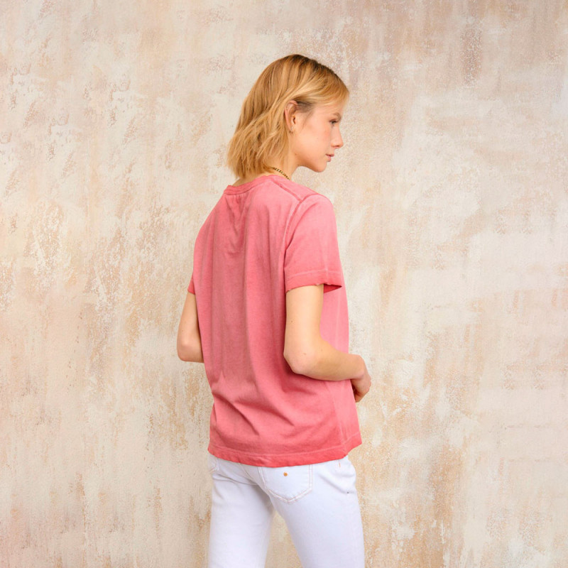 Camiseta con tejido teñido en prenda con efectos degradados y únicos. Tratamiento con efecto desgastado y consumido en los bordes.