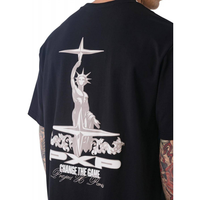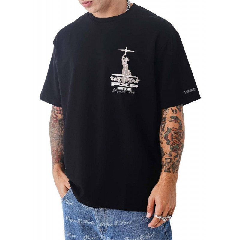 Esta camiseta de corte holgado combina comodidad y estilo urbano. Confeccionada en tejido suave de alta calidad, presenta cuello redondo, mangas cortas y un logo estampado en el pecho con ilustración de la Estatua de la Libertad. La ilustración en la espalda aporta un detalle original y distintivo.