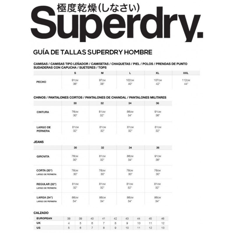 - Corte relajado: el corte clásico de Superdry. Una prenda ni muy estrecha ni muy holgada, simplemente perfecta. Elige tu talla habitual