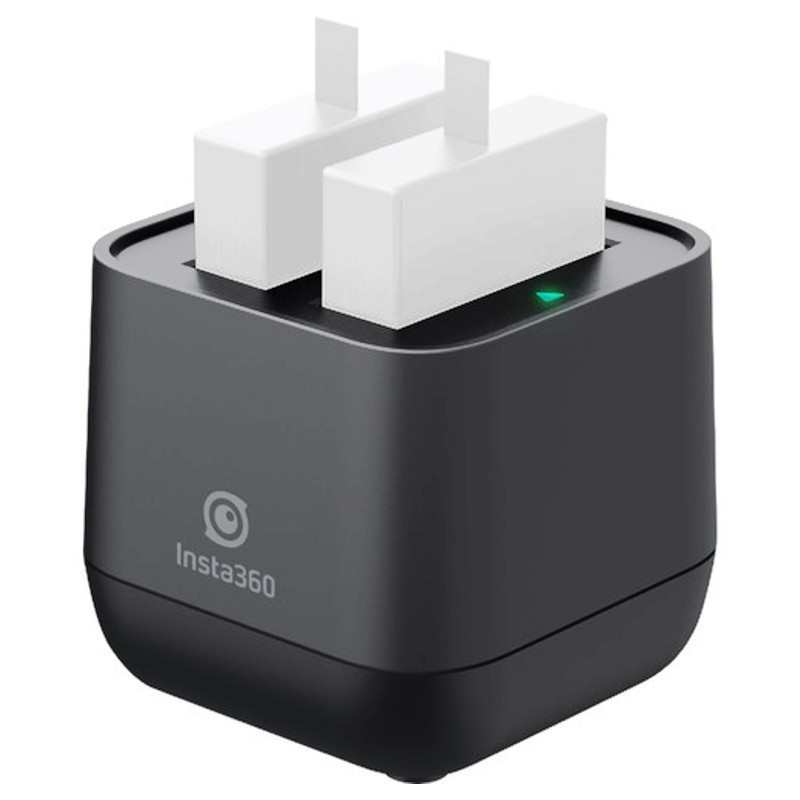 La estación de carga de la batería para la cámara ONE X de Insta360 carga dos baterías ONE X simultáneamente en aproximadamente 60 minutos. La estación de carga cuenta con tres luces LED que indican rojo para carga en progreso, verde para carga completa y alterna de rojo a verde si la batería no está insertada. El cargador se alimenta con un adaptador micro-USB y admite una o dos baterías LiPo de 1200 mAh 4.35 V específicamente diseñadas para funcionar con la cámara ONE X. Las pilas no están incluidas.