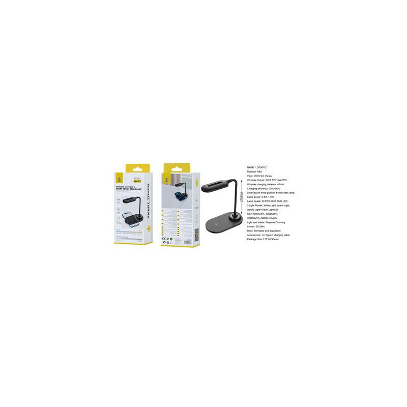 NA0471 NE Lámpara de mesa flexible con carga inalámbrica 15W, Con panel táctil, Luz 3000-7000K, Negro