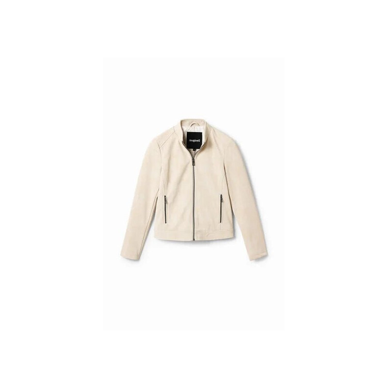 Chaqueta estilo motero de manga larga, cuello mao y textura muy suave, efecto ante. Bolsillos con cremallera.