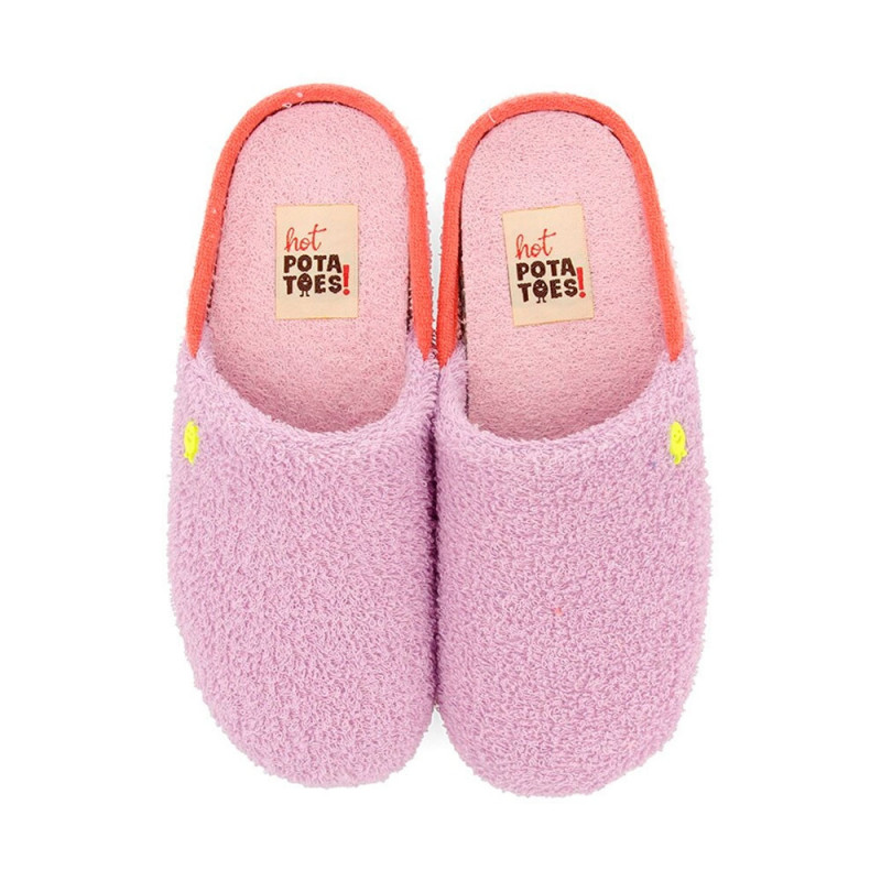 Las zapatillas de estar por casa más divertidas y cómodas están en Hot Potatoes. ¡Descubre la colección de Pimavera Verano! Zapatilla de casa destalonada con corte, ribete y planta suave y transpirable combinando diferentes tonos. Forro de poliéster transpirable. La plantilla es extraíble de material 100% reciclado y la suela de goma natural en color flúor con pintas de colores. Las "patatillas" más confortables, divertidas y sostenibles están en Hot Potatoes.