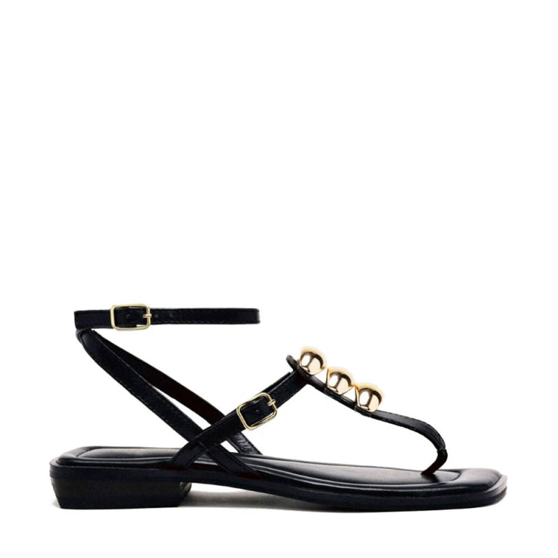 - Sandalias planas de piel tipo griegas con apliques metálicos.