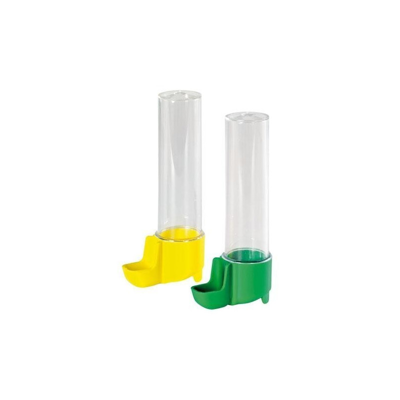 - Bebedero de plástico externo, con base inclinada, ideal para gua y semillas