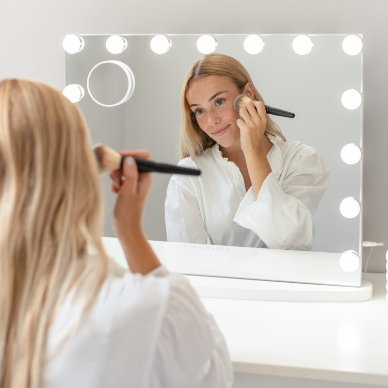 Espejo en color blanco con 15 bombillas LED y base ovalada perfecto para maquillarse y hacerse rutinas de belleza. Puedes ajustar el color y la intensidad de la luz con los botones táctiles. Incluye un espejo de aumento x5.