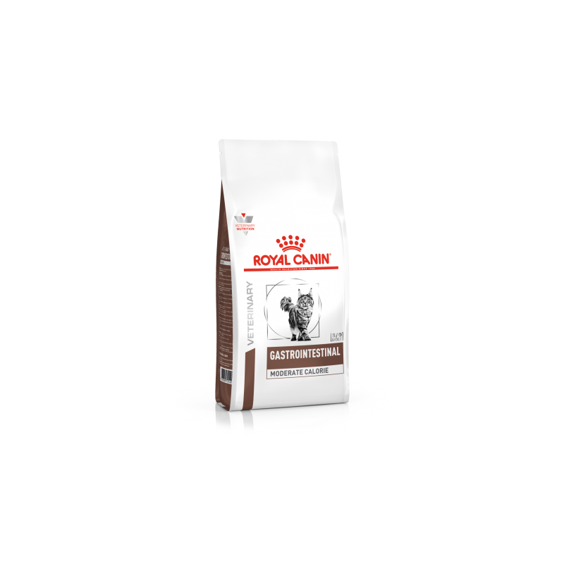 Royal Canin Gastrointestinal Moderate Calorie es un alimento dietético completo para el tratamiento de las enfermedades gastrointestinales en gatos con tendencia al sobrepeso o que requieren una aportación moderada de grasas.
