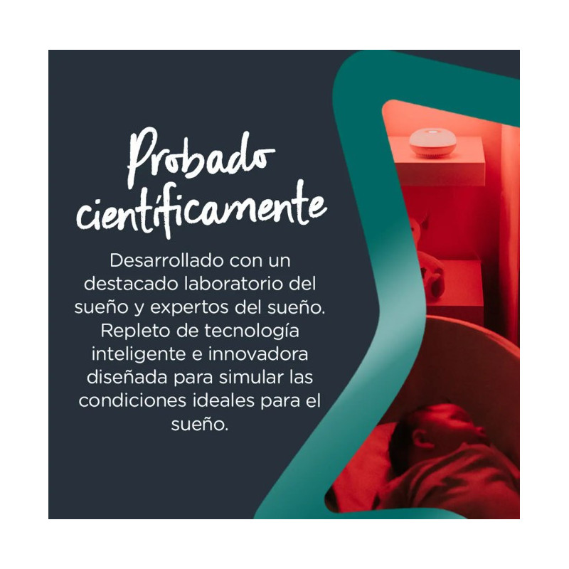 Esta novedosa lámpara emite una luz roja que no altera los niveles de melatonina del bebé. Si se despierta para las tomas o por sí mismo volverá a dormirse fácilmente en un sueño profundo y prolongado. La luz roja junto al ruido rosa, que simula los sonidos que los bebés escuchan en el útero materno, crean el ambiente idóneo para el sueño y el descanso.