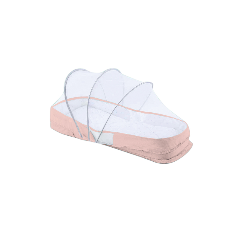 Cama cuna de viaje con mosquitera en mochila. Color ROSA