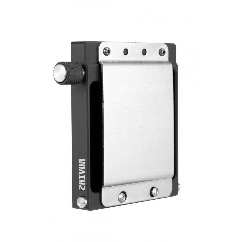 En un lado, el plato base acepta el plato de montaje del Crane 3 LAB o el WEEBILL LAB y en el otro lado cuenta con un cierre que permite sujetar las correas provistas en el exterior del cinturón y el estuche.