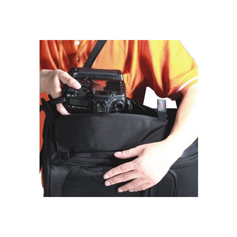 La capacidad máxima puede adaptarse a una cámara réflex digital profesional con objetivo acoplado, 4-6 objetivos (hasta 300 mm f/2,8), 2 unidades de flash y accesorios. Un bolsillo frontal externo se adapta a un portátil de hasta 11 pulgadas, y el bolsillo superior encima es perfecto para guardar otros elementos esenciales que necesita a mano, como tapas de lentes, filtros, teléfono, etc. También se incluye el sistema de transporte de trípode de equilibrio óptimo de Vanguard.