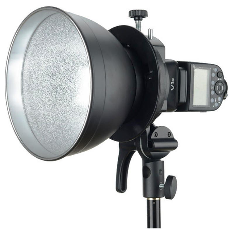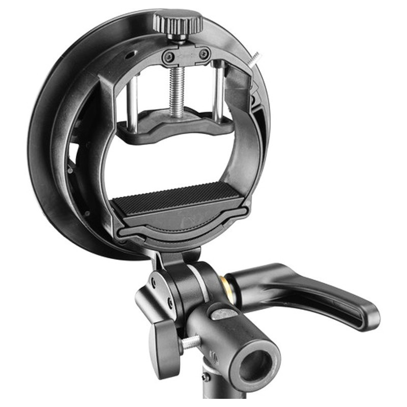 La Godox S2 rótula variable Bowens tiene una base que se puede colocar directamente sobre la espiga de un pie de estudio o bien sujetarse comodamente con la mano.