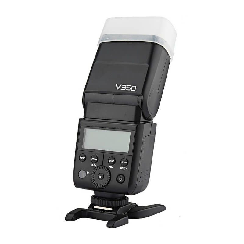 La pistola de flash Godox V350 es una pistola de flash pequeña y ligera con un número guía de 36 que se adapta perfectamente a las cámaras sin espejo y compactas. Pesa solo 200 g y cuando se monta en la cámara y apunta la cabeza hacia adelante alcanza una altura máxima de 95 mm. A pesar de su pequeño tamaño, su cabezal de flash gira 270º horizontalmente y 97º verticalmente. Esto permite recibir mucha libertad para reflejar la luz del flash desde el techo y las paredes, independientemente de la orientación de la cámara de las imágenes en los marcos vertical y horizontal.