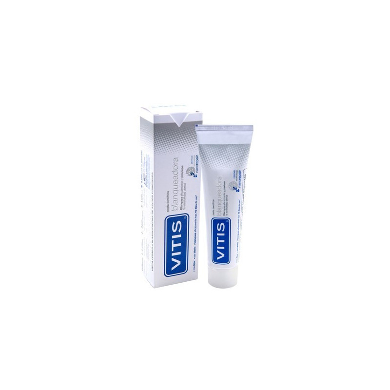 VITIS Blanqueadora es la pasta dentífrica de uso diario que blanquea y recupera el blanco natural de los dientes, eliminando las manchas y evitando su formación. Además, protege el esmalte dental.