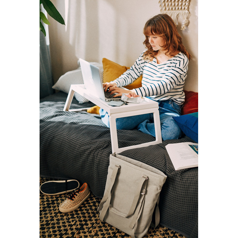 Al tener un agujero para el cable, podrás cargar la tableta cómodamente.Al tener las patas plegables, la bandeja ocupa poco cuando no la usas.Tiene una acanaladura para que coloques la tableta o un libro.