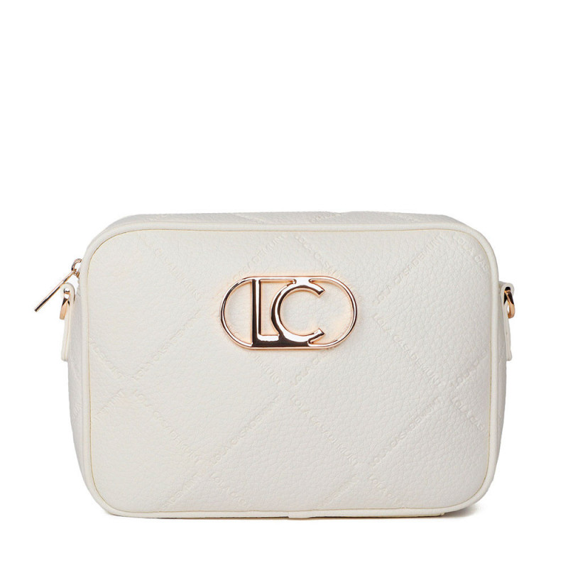 Bandolera elegante de efecto piel con diseño de monograma en rombos. Incorpora un llamativo logo ovalado metalizado en el frontal. Correa ajustable con detalles de la marca. Cierre superior con cremallera para mayor seguridad.