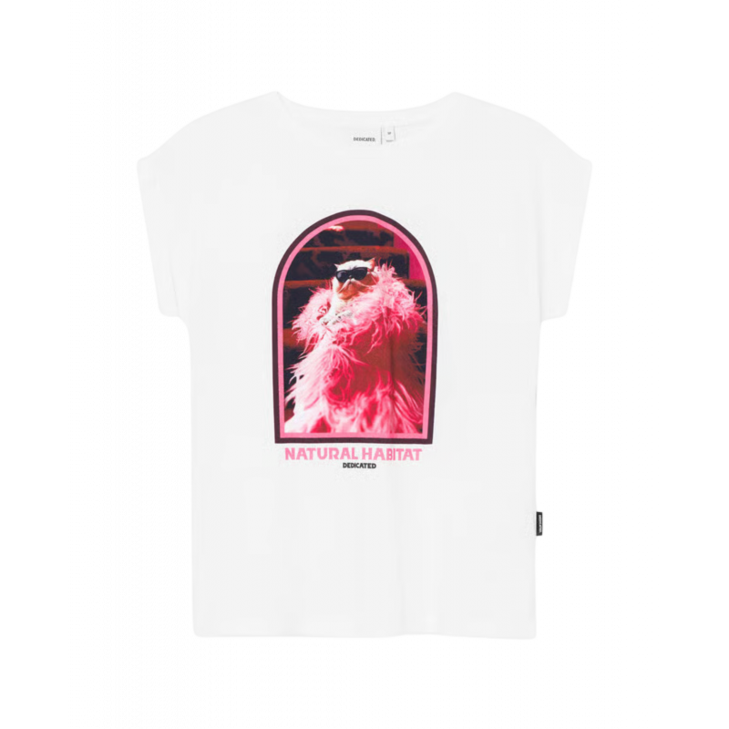 La camiseta Visby Natural Habitat White de Dedicated Brand fusiona estilo contemporáneo con materiales responsables. Confeccionada en 100 % algodón orgánico certificado ROC™ y Fairtrade, ofrece suavidad, transpirabilidad y una elección más consciente.  Su corte es ligeramente entallado (slim fit) y presenta mangas cortas con puños doblados, un cuello redondo con rib fino y discretas aberturas laterales que añaden movimiento y comodidad.  El color blanco puro funciona como base neutra ideal para cualquier outfit urbano o casual, y el mensaje gráfico “Natural Habitat” aporta una referencia temática sutil que refuerza la filosofía de sostenibilidad de la marca. Detalles del producto: * Material: 100 % algodón orgánico certificado ROC™ y Fairtrade * Corte: slim fit * Cuello redondo con rib fino * Mangas cortas con puños doblados * Aberturas laterales * Color: Blanco