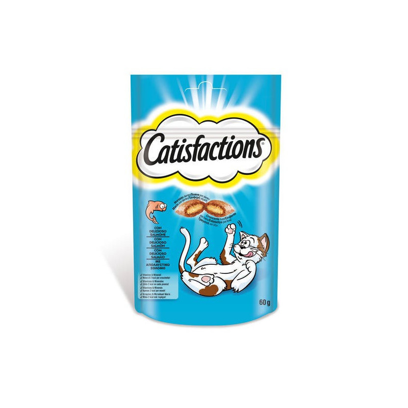 A todos los gatos les encantan las chucherías y seguro que el tuyo no es una excepción. Dale un pequeño capricho comprando estos ricos snacks Catisfactions de salmón. En cuanto pruebe uno no querrá dejarlos. Su aroma es casi tan bueno como su sabor.